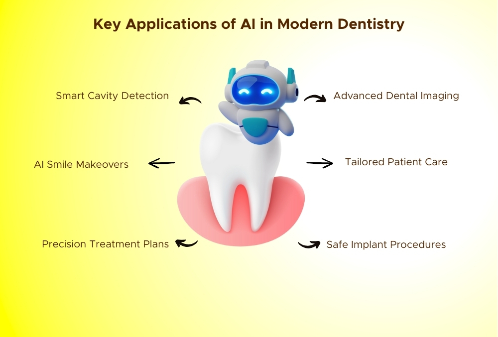 Ans. AI is widely used in dentistry for early diagnosis of cavities, gum disease or cancer, designing custom aligners, improving accuracy in root canals and restorations, assisting in implant surgeries, predicting long-term oral health risks. These applications help dentists provide faster, safer, more precise treatments.